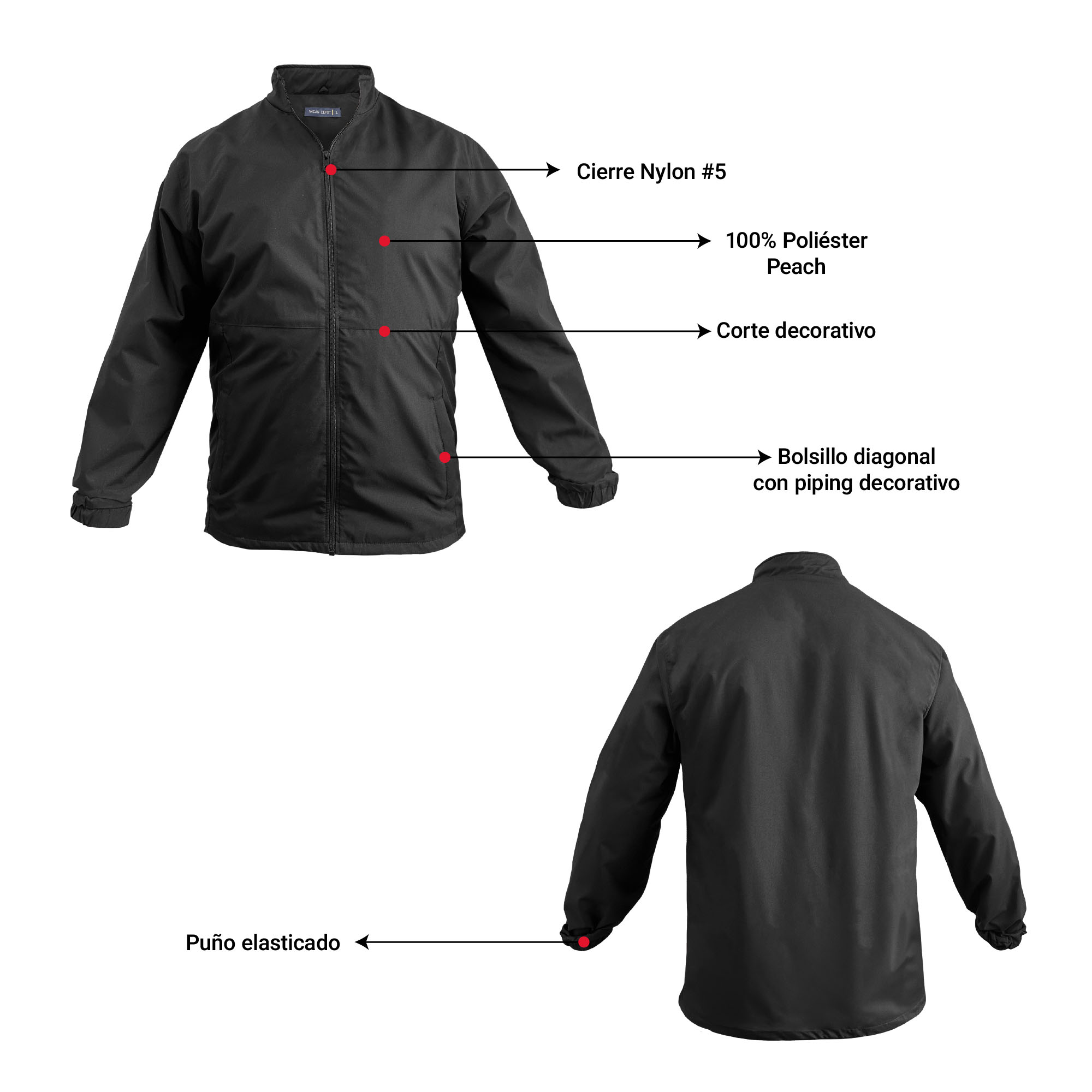 Casaca ejecutiva clásica 3/4 en 100% Poliéster Peach. Calidad premium, cortes decorativos en delantero, diseñada para uso laboral, cómoda y liviana. Cierre principal Nylon #5. Puños elasticados. Pretina con elástico y ajustador para mejor calce. Bolsillos principales delanteros verticales con cierre y piping decorativo. Forro en maya 100% nylon, respirable al tono del cuerpo.